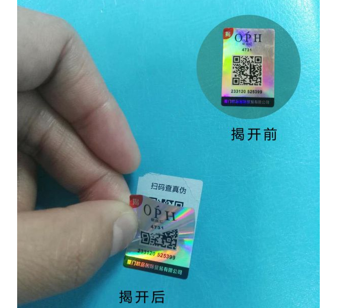 揭開式雙層防偽標簽可印制企業(yè)名稱、產(chǎn)品Logo、產(chǎn)品真?zhèn)尾樵兎椒ǖ刃畔?,標簽表面沒有防偽暗碼,顧客進行防偽查詢前需將標簽表層揭開,其粘在產(chǎn)品包裝上那有些膠上就有相應(yīng)的暗碼。還可聯(lián)絡(luò)二維碼掃描辨真?zhèn)蝸碛∷ⅰ?br />